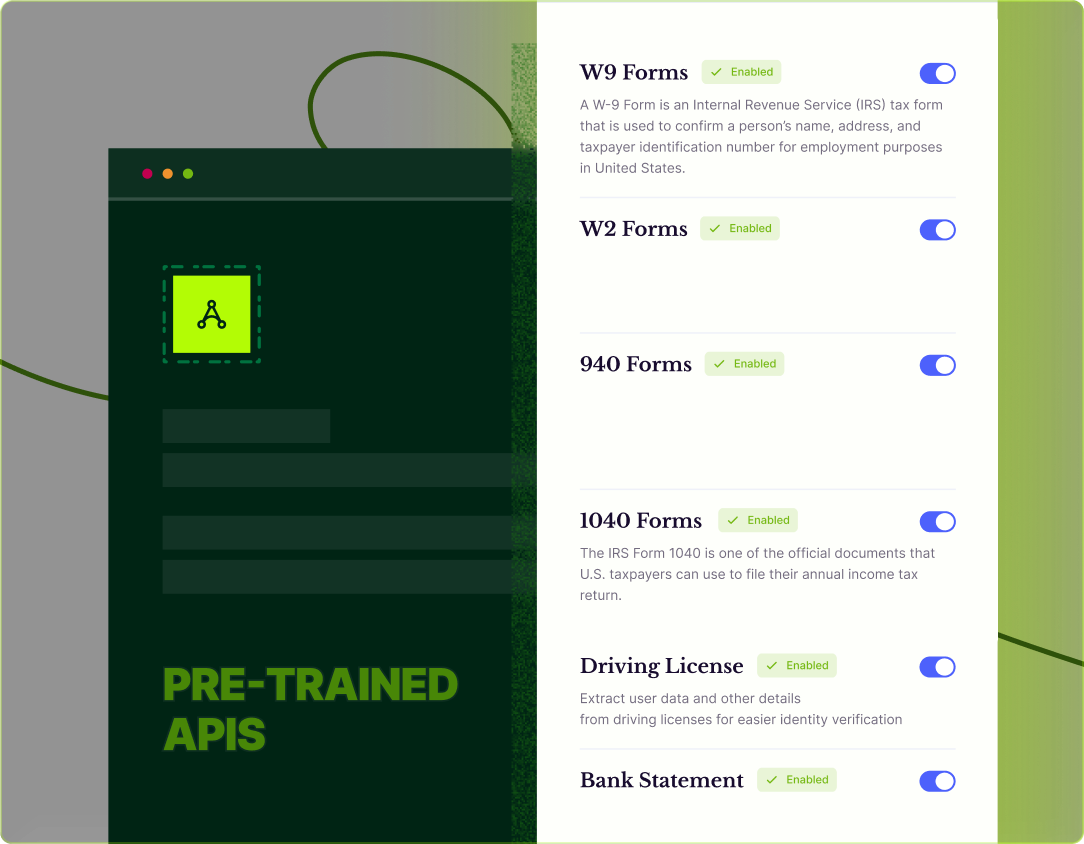 Create your own API by training on your model with as few as 50 documents. As the volume of documents increases, the more accurate it becomes.